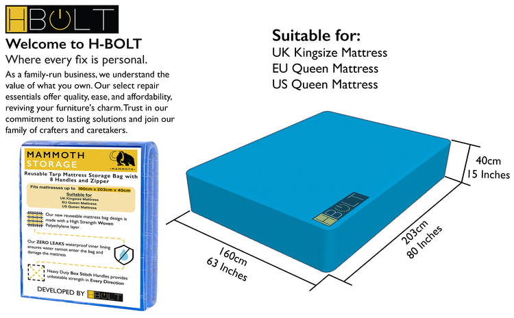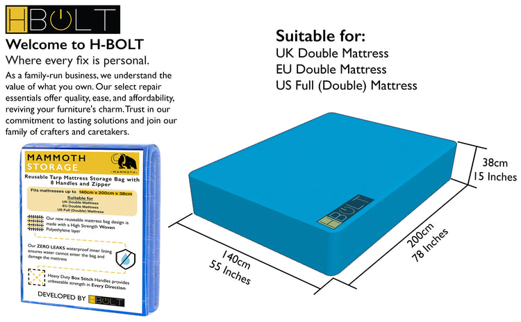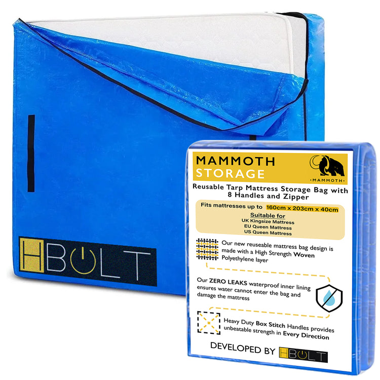 The MAMMOTH Reusable Mattress Storage Bag is the ultimate solution for protecting your mattress during moves, storage, or renovations. Crafted from heavy-duty waterproof tarp material with a secure zipper and reinforced with 8 heavy-duty box-stitched handles, this bag is designed for maximum durability and convenience.